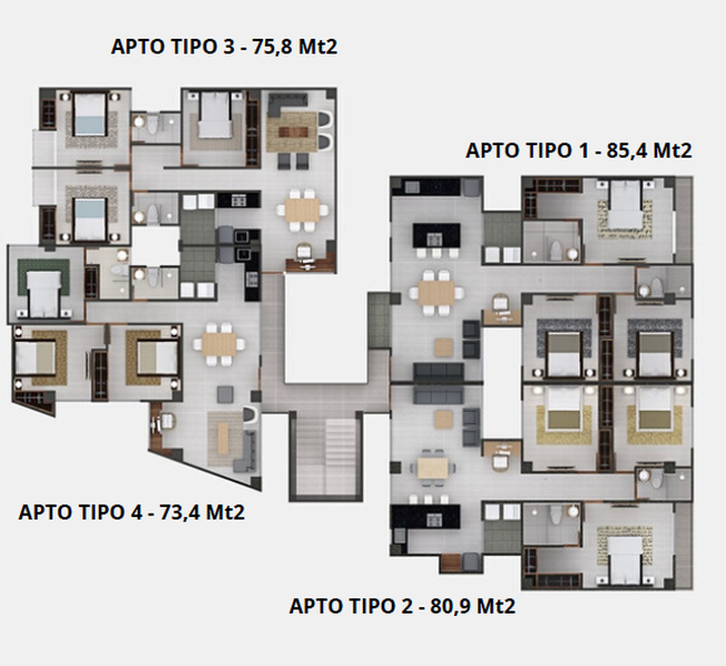 Apartamentos de 3 habitaciones (95 m2 y 102 m2) y 2 habitaciones + estudio (102 m2 y 95 m2 )